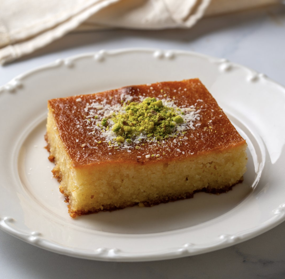 Soft semolina sponge cake soaked in sweet syrup with a light citrus aroma.