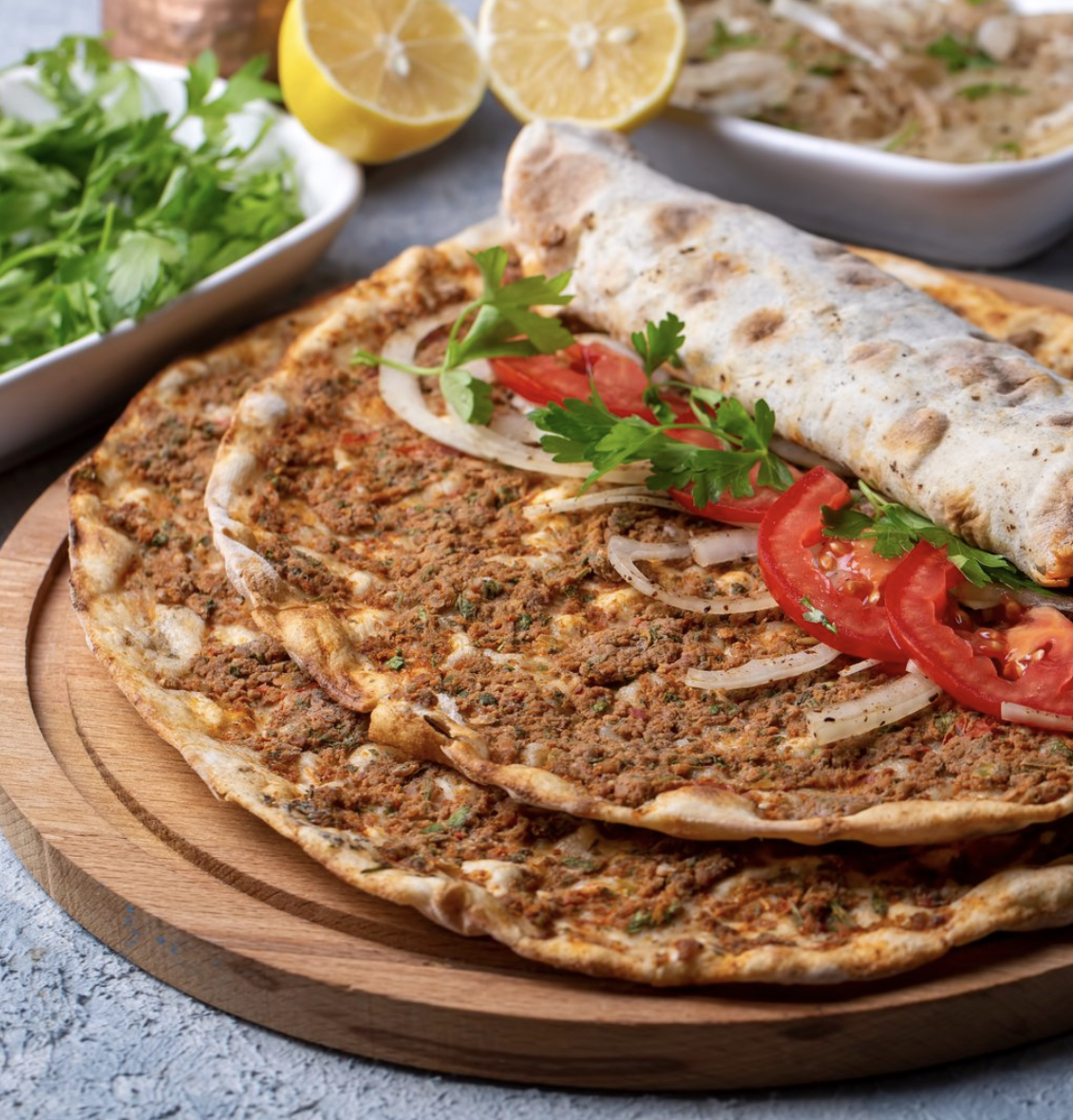 Thin, crispy flatbread topped with spiced minced meat, herbs, and a hint of citrus.